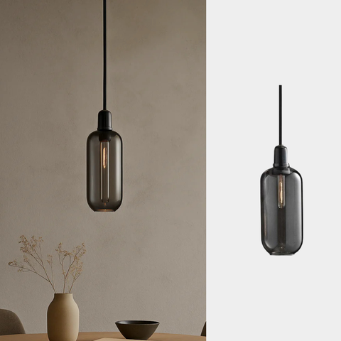 Elegancia en su forma más pura. Su pantalla de vidrio ahumado filtra la luz con sutileza, creando una atmósfera cálida y moderna. Perfecta para realzar comedores, barras o rincones de lectura con un toque minimalista.