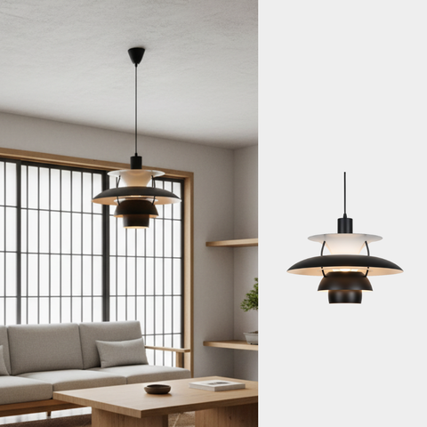 Un clásico moderno que destaca con personalidad propia. Su diseño de discos en capas, acabado en negro mate con detalles en blanco opalino, ofrece un equilibrio perfecto entre estilo escandinavo y funcionalidad. Ideal para comedores, livings, escritorios o entradas que buscan un toque sofisticado y cálido.