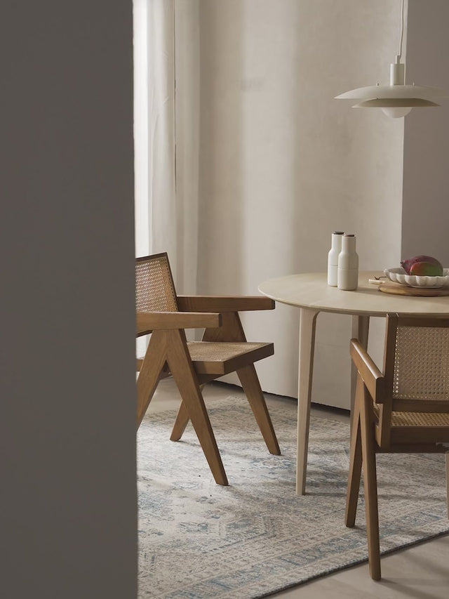 Aporta elegancia y calidez con su diseño artesanal en madera y ratán. Su estilo sofisticado la hace ideal para comedores o como sitial en livings, integrándose perfectamente en ambientes clásicos y contemporáneos.
